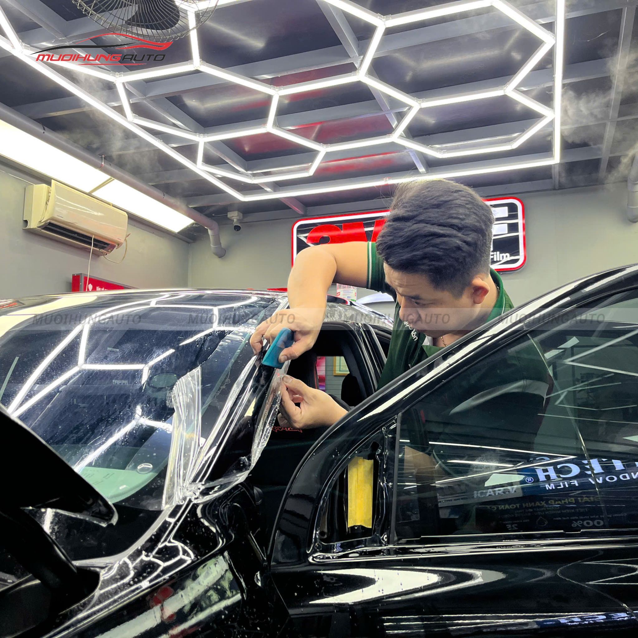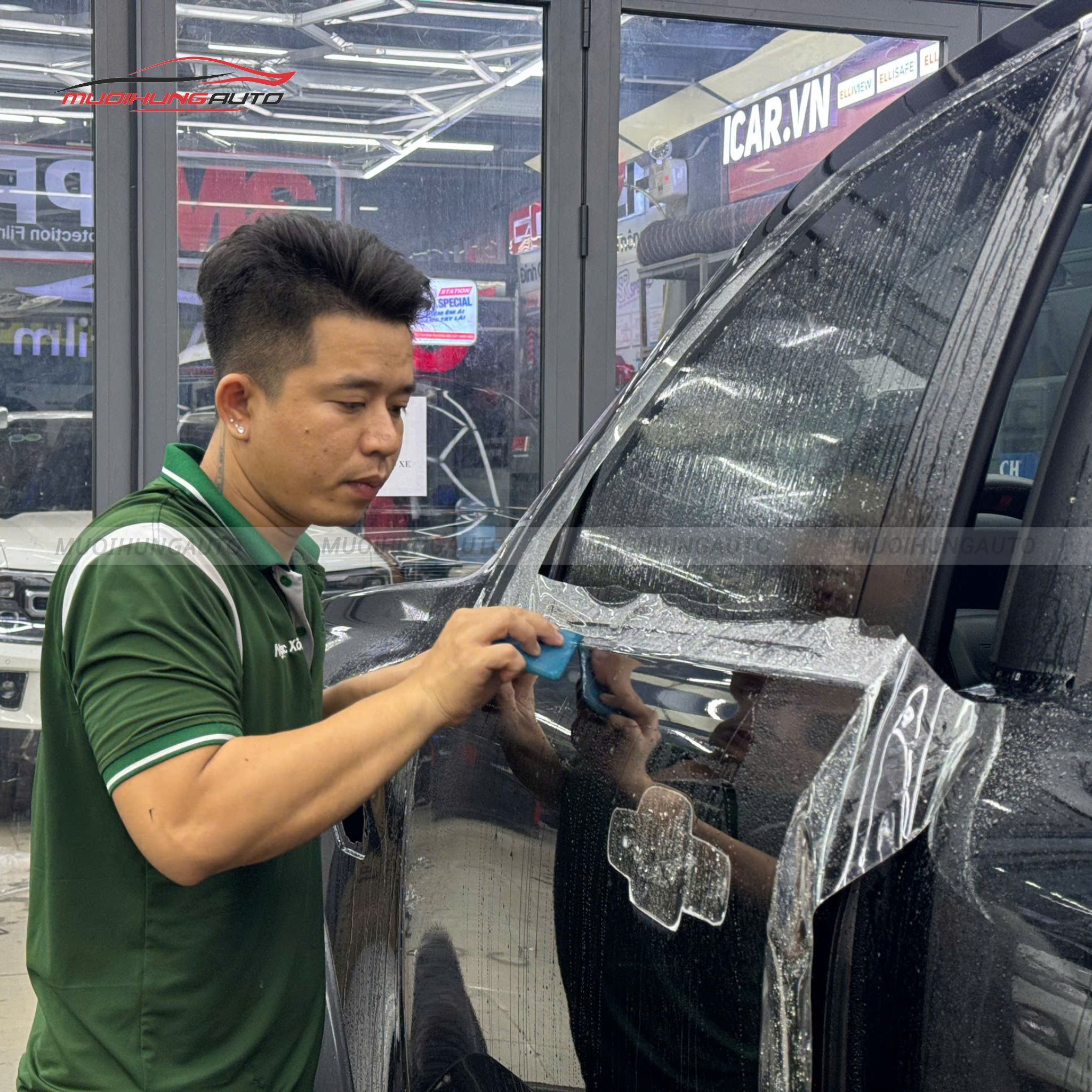 Quy trình dán PPF được thực hiện trong phòng thi công đạt chuẩn. Các thao tác được thực hiện cẩn trọng, tỉ mỉ, giúp lớp phim bám chắc chắn, đảm bảo bề mặt mịn màng, không bọt khí, gợn sóng.