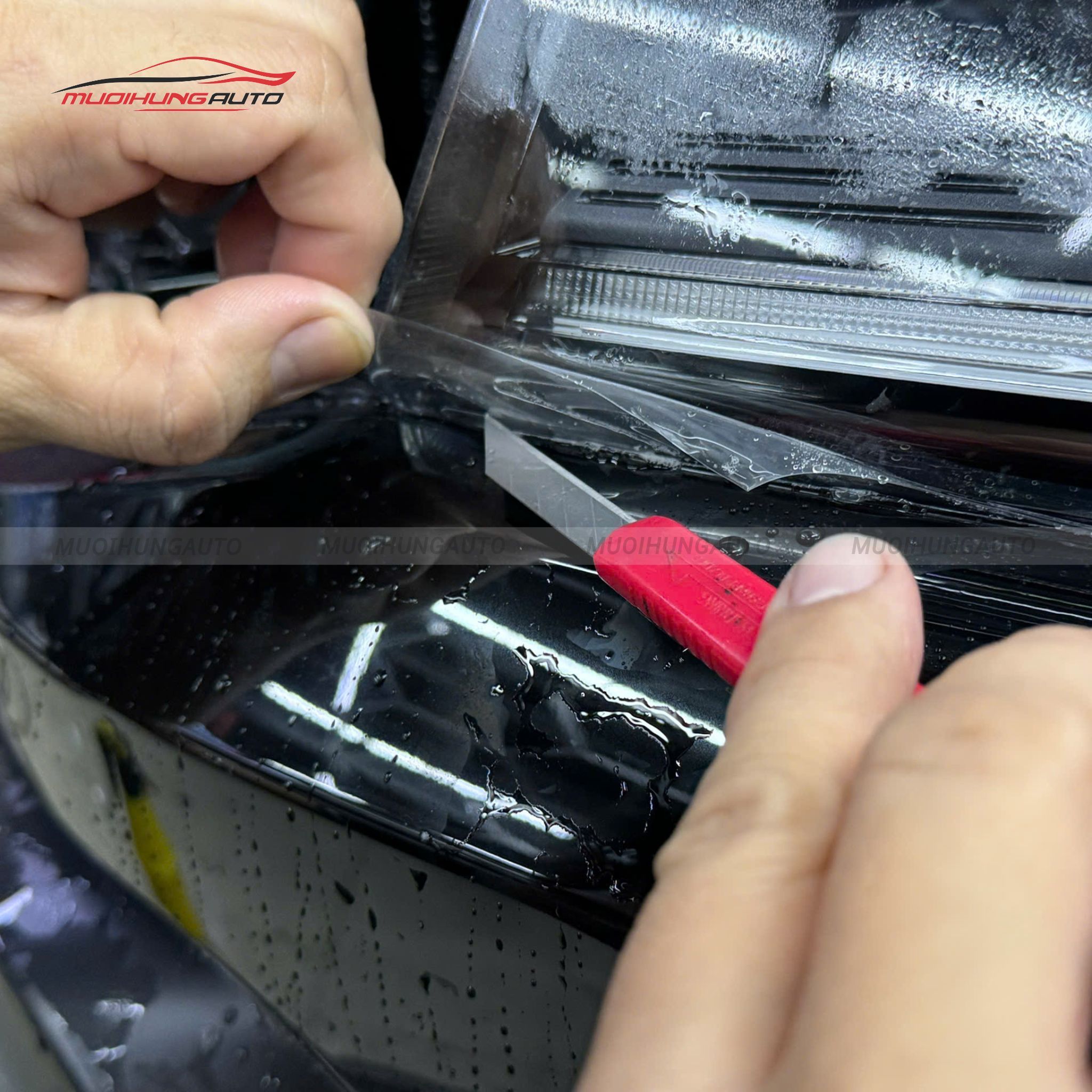 Kỹ thuật viên tiến hành cắt PPF chính xác theo từng chi tiết trên xe, đảm bảo ôm sát vừa vặn với từng đường nét trên ô tô.