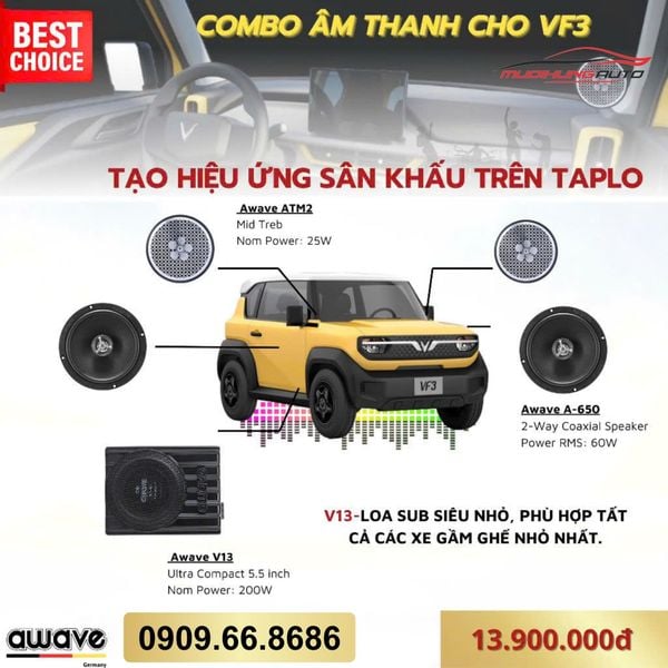 Gói nâng cấp âm thanh Awave cho Vinfast VF3 - Combo 11 tại Mười Hùng Auto có giá là 13.900.000 đồng.