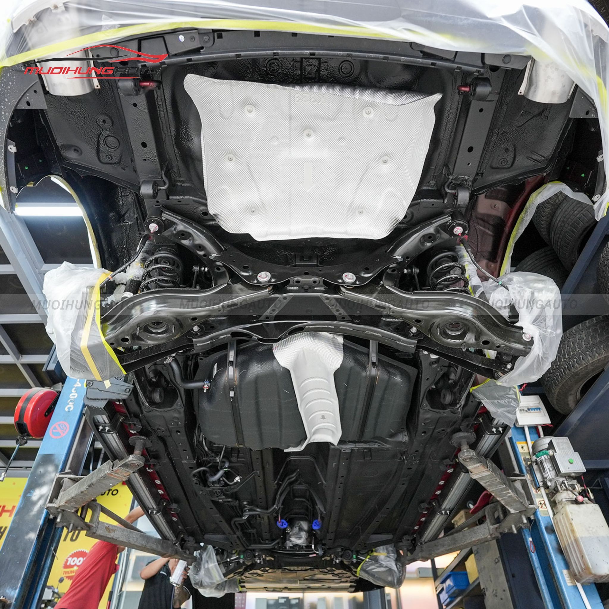 Tháo bánh xe, tấm chắn bùn và che chắn cẩn thận các chi tiết không cần phủ gầm.