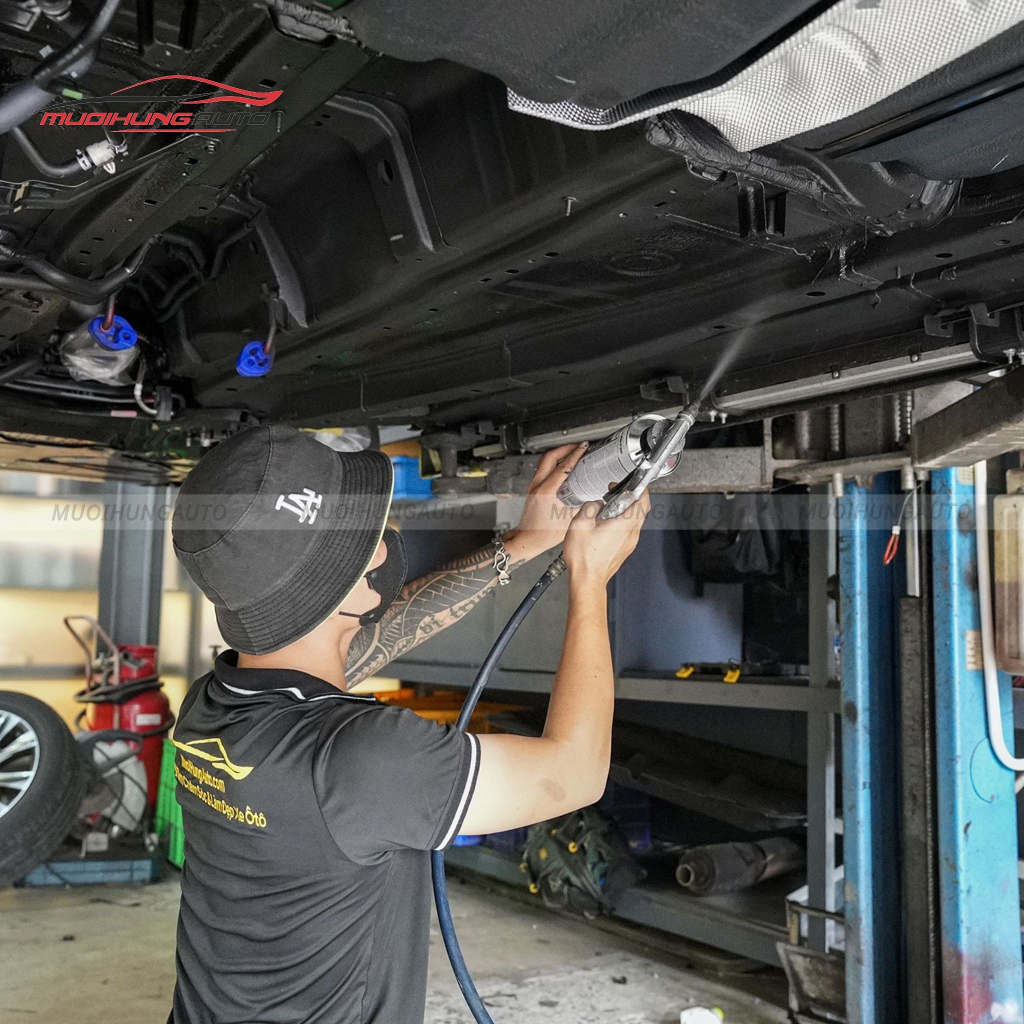 Kỹ thuật viên tiến hành phun lớp phủ gầm bằng thiết bị chuyên dụng, đảm bảo phủ đều toàn bộ bề mặt gầm xe.