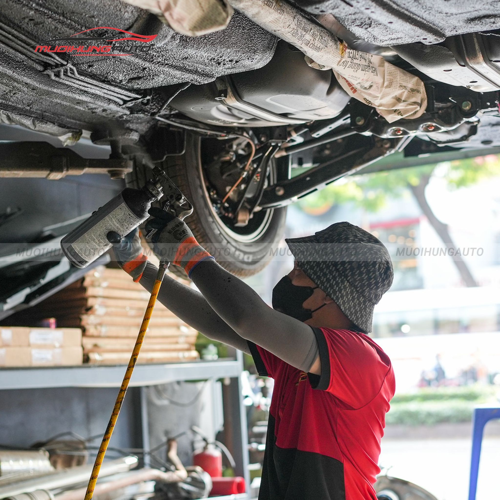 Kỹ thuật viên sử dụng thiết bị phun chuyên dụng để phủ sơn lên bề mặt gầm. Lớp phủ được thi công đồng đều, đảm bảo khả năng bảo vệ tối ưu.